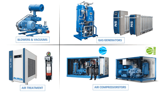 کمپرسورهای هوای فشرده اسکرو از نوع Oil Injected و Oil Free ، مولد گاز نیتروژن ، مولد گاز اکسیژن ، بوستر کمپرسورها ، انواع درایرهای تبریدی و جذبی هوای فشرده ، مخازن ذخیره هوای فشرده، اکسیژن و نیتروژن، میکروفیلترها و سایر ادوات و تجهیزات مرتبط با صنعت هوای فشرده و گازهای صنعتی محصولات قابل عرضه این شرکت می باشند.